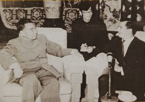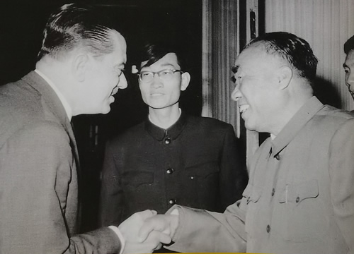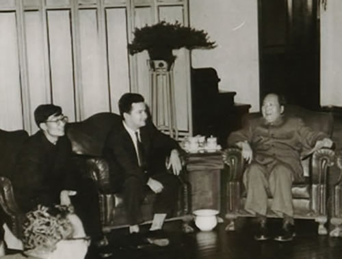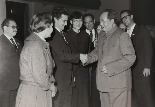 1961年4月19日,毛泽东主席接见以古巴教育部长阿曼多•阿特•达瓦洛斯为首的古巴文化代表团全体团员。图为毛主席与阿曼多•阿特•达瓦洛斯亲切握手。中间戴眼镜的年轻中国人是王怀祖(时为北外教师,由外交部借调担任领导人西语翻译。)此照片登在1961年4月21日人民日报的头版头条上,那时我还未出生。