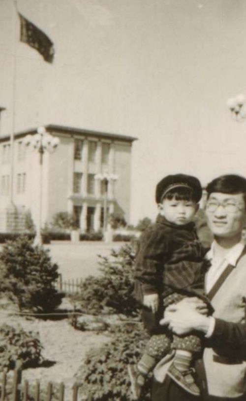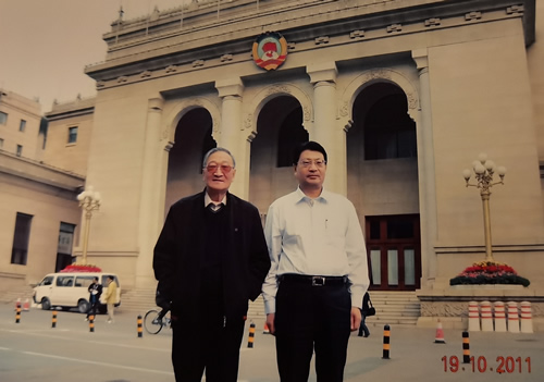 图为王怀祖与次子王晓青于2011年在全国政协礼堂门前合影留念。1956年中共第八次党的代表大会在这里举行,王怀祖在会议上首次担任毛主席致