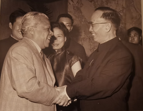 1961年1月9日,中国友好代表团团长郭沫若(时任政务院副总理)在古巴和古巴著名诗人纪廉亲切握手。图中间为母亲王辉(时任新华社摄影部记者兼西语翻译)。在母亲王辉右手位置就是中国驻古巴大使申健同志(著名的隐蔽战线龙潭虎穴“后三杰”之一)