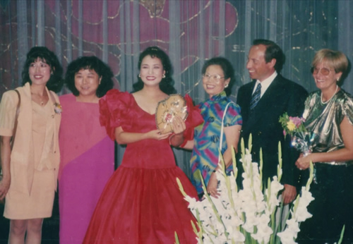1994年8月29日,以彭丽媛女士为主要成员的中国友好艺术团到西班牙巴塞罗那为当地华侨作慰问演出,母亲王辉(右3)做为新华社摄影部原主任记者、局级离休干部(她建国前从大城市投奔解放区参加革命工作)及中国旅西华侨代表向艺术家、中国著名歌唱家彭丽媛女士(左3)敬献花篮和赠送礼品