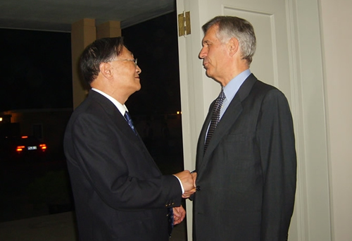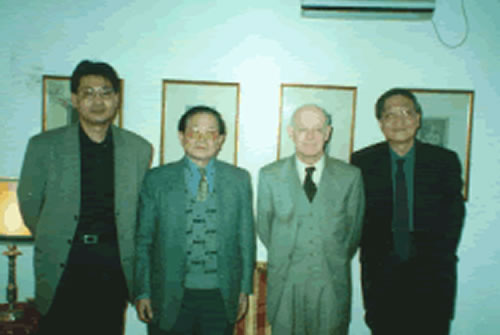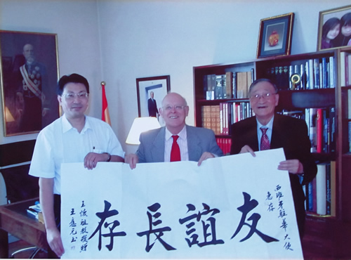 2005年8月期间,王怀祖教授与大学同班同学黄志良大使(左2)及时任西班牙驻华大使布雷戈拉特阁下(右2)合影留念,左1是王怀祖教授之子王晓青