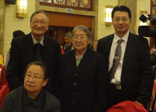 2013年10月18日,王怀祖携子王晓青参加中国延安精神研究会主办的纪念毛泽东主席诞辰120周年联谊大会,与近300名革命后代相聚一堂。图为王怀祖父子二人与毛泽东主席长女李敏(后排中)、小女李讷(前排坐者)留下唯一珍贵合影。四年后的这一天,2017年10月18日,中国共产党的十九大在北京胜利召开。(特注:此图片由联合会高级顾问孙占军同志提供)