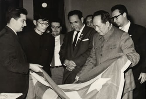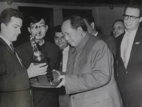 1961年4月19日,毛泽东主席接见以古巴教育部长阿曼多•阿特•达瓦洛斯为首的古巴文化代表团全体团员。图为毛主席接受阿曼多•阿特•达瓦洛斯赠送文化礼品。左边戴眼镜年轻中国人是王怀祖(时为北外西语系教师,由外交部借调任