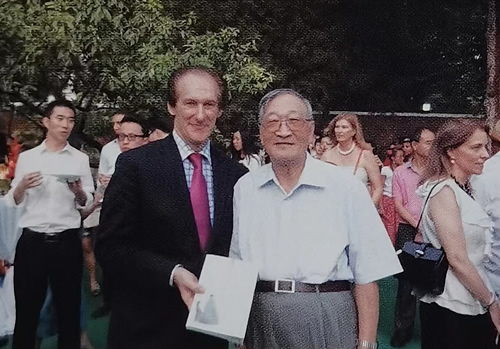 王怀祖携子王晓青向时任西班牙驻华大使布雷戈拉特阁下赠送中国书法